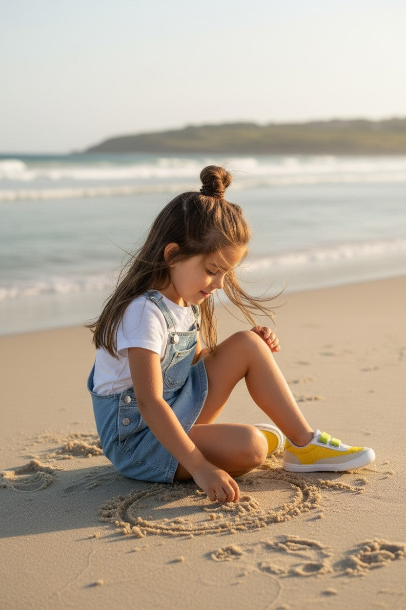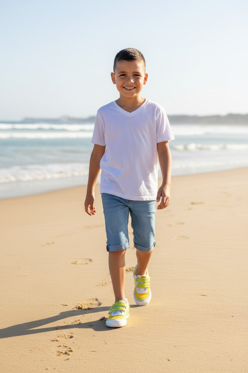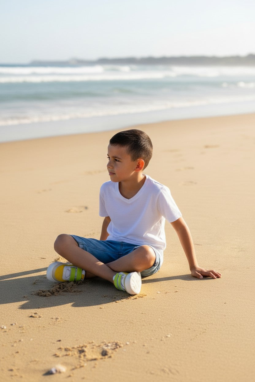 Ligera y muy transpirable. Con upper de malla fresca y detalles en piel Tricolor blanco, amarillo y lima, combina confort y estilo veraniego.