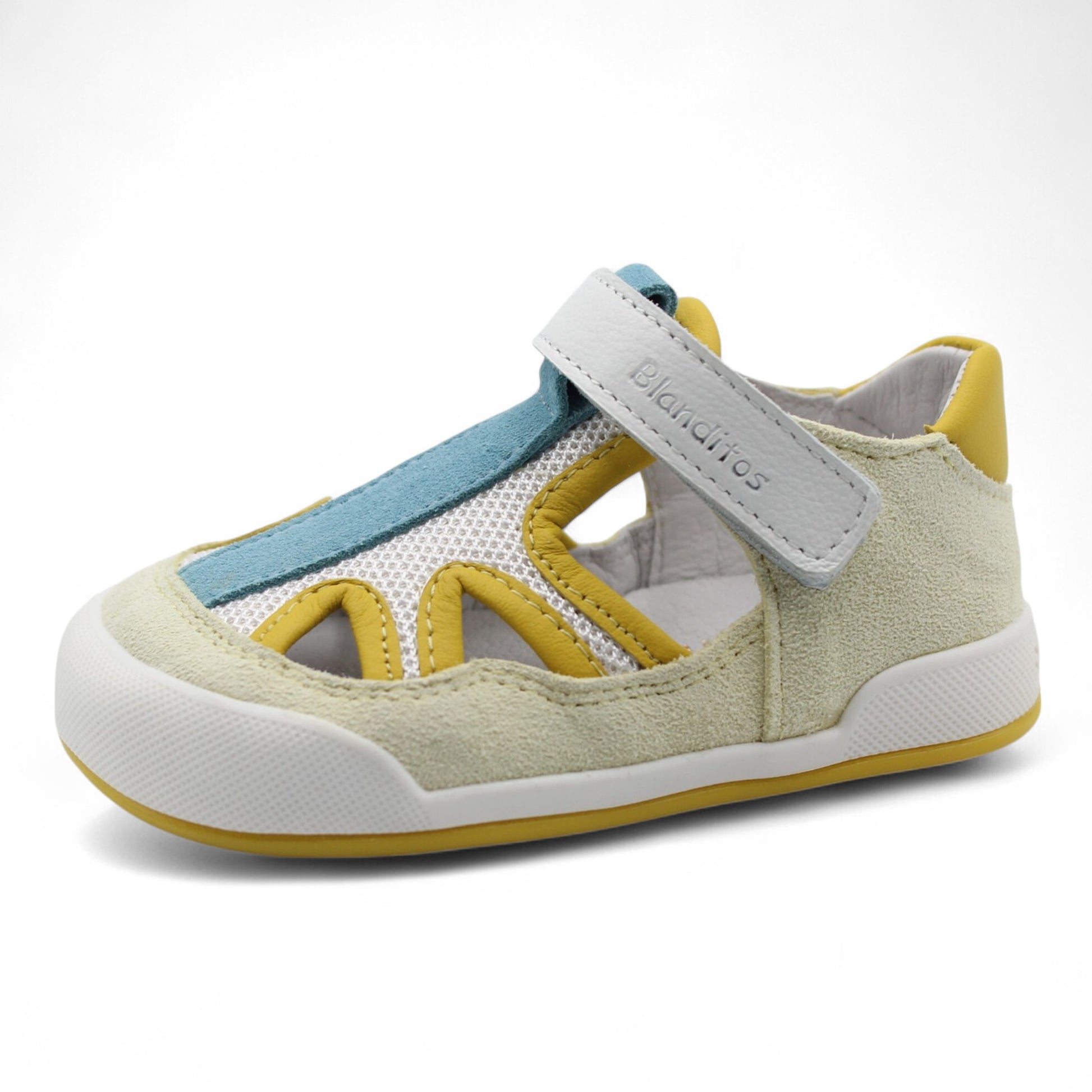 Sandalia de serraje, plantilla extraíble en piel y suela de goma de entre 3,5 y 4,5 mm según tallaje.